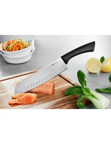 Blade of 19,5 cm in high quality Japanese steel and ergonomic handle in synthetic material for a good grip.